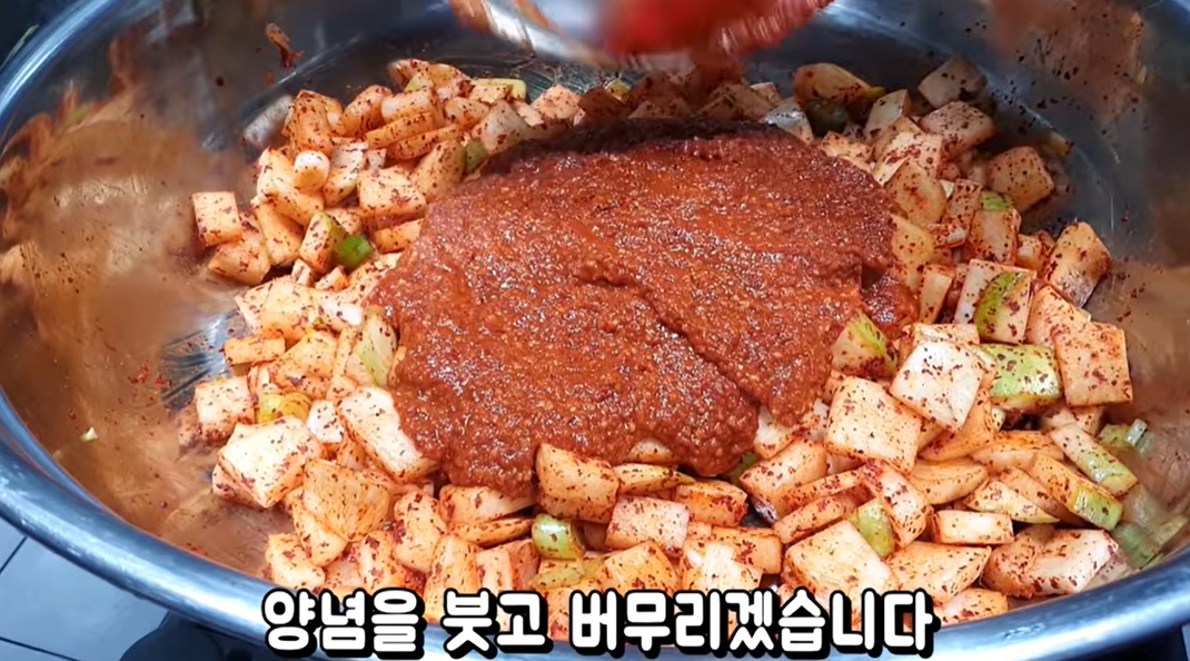 ✅ 무에 고춧가루 한 컵을 넣어서 코팅해 줍니다.