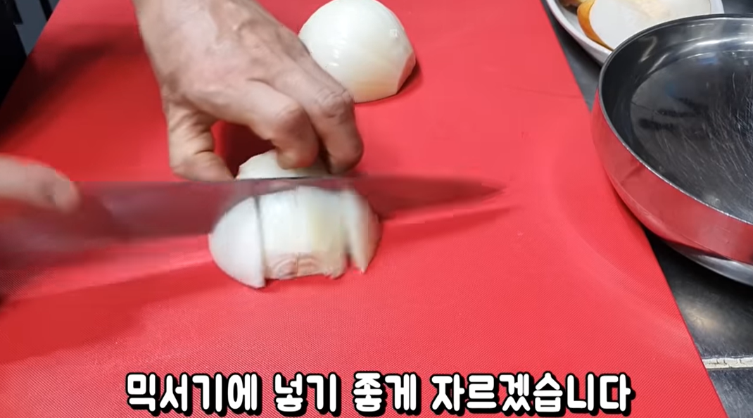 ✅ 믹서기에 넣기 좋게 양파, 배, 사과, 생강, 대파를 썰어줍니다.