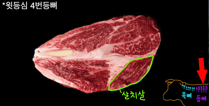 살칫살은 소 한 마리에서 단 5키로 정도만 얻을 수 있는 부위로 윗등심 중에서 가장 가치가 높은 부분이기 때문에 살칫살이 많이 붙어있는 고기가 윗등심에서 가장 비싸고 좋은 부위라고 할 수가 있겠습니다.