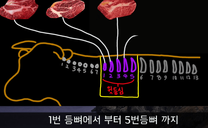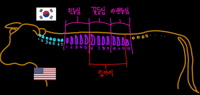 제가 아까 한우는 등뼈 1번에서부터 5번까지가 윗등심, 6번에서부터 9번까지가 꽃등심, 10번에서부터 13번까지가 아랫등심이라고 설명해 드렸죠.