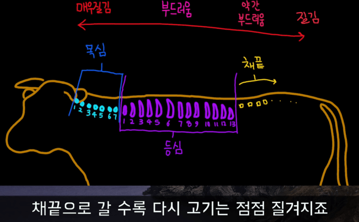 그리고 등심을 지나 채끝으로 갈수록 다시 고기는 질겨지죠.