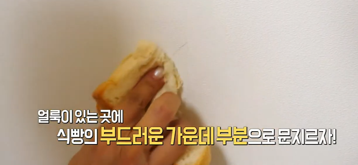 부드러운 식빵 부분이 벽지에 대고 살살 문지르면 벽지가 새것처럼 깨끗해집니다.
