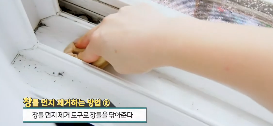 창틀에 물을 뿌려 먼지를 불린 후 식빵 수세미로 문지르면, 창틀이 반짝반짝 새것처럼 깨끗해집니다.