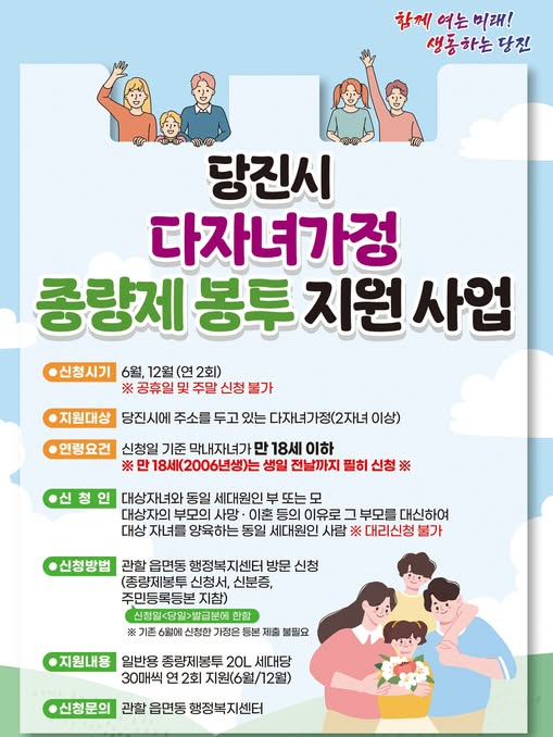 - 당진시는 다자녀 가정의 생활비 부담을 줄이고자, 종량제 봉투를 무상 지원합니다.