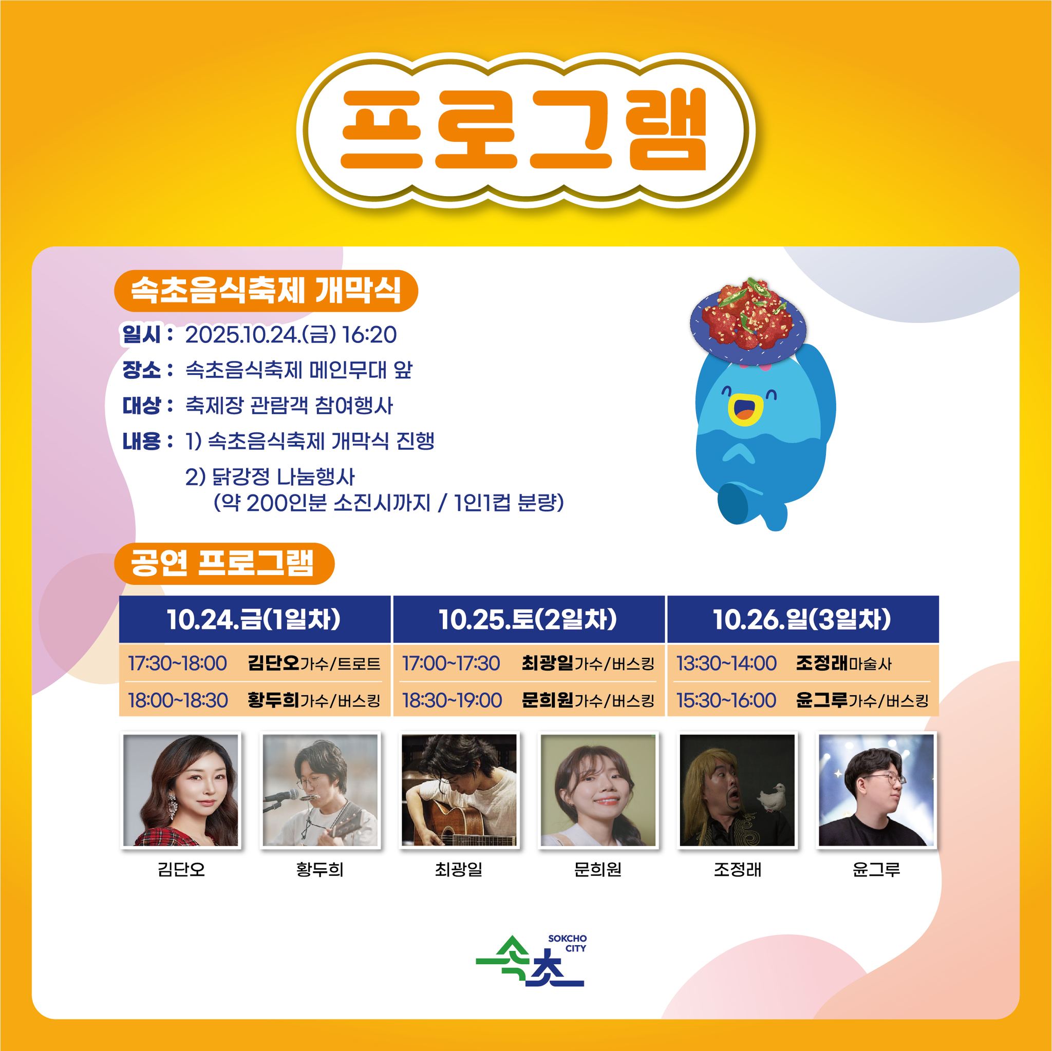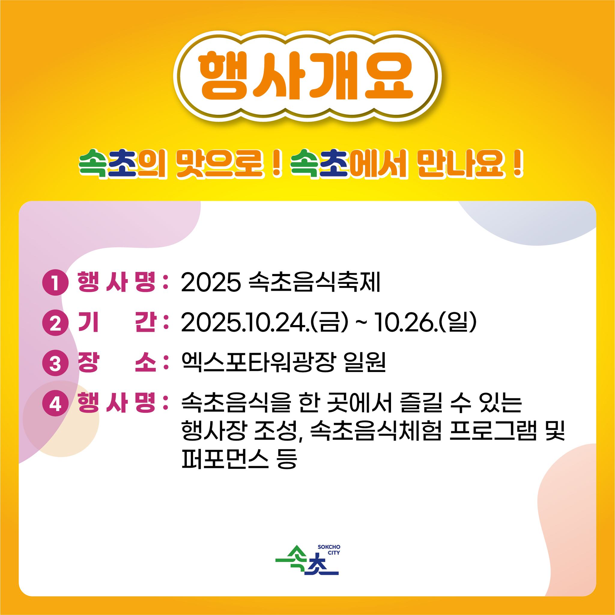 이 축제는 속초의 대표 음식과 다양한 프로그램을 한자리에서 즐길 수 있는 행사로, 속초시청 공식 페이스북을 통해 안내되고 있습니다.