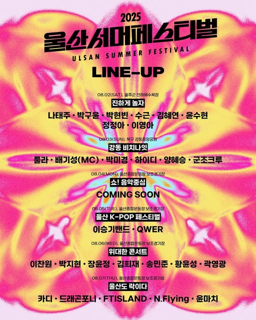 다음은 2025 울산서머페스티벌의 공연 일정과 라인업입니다.