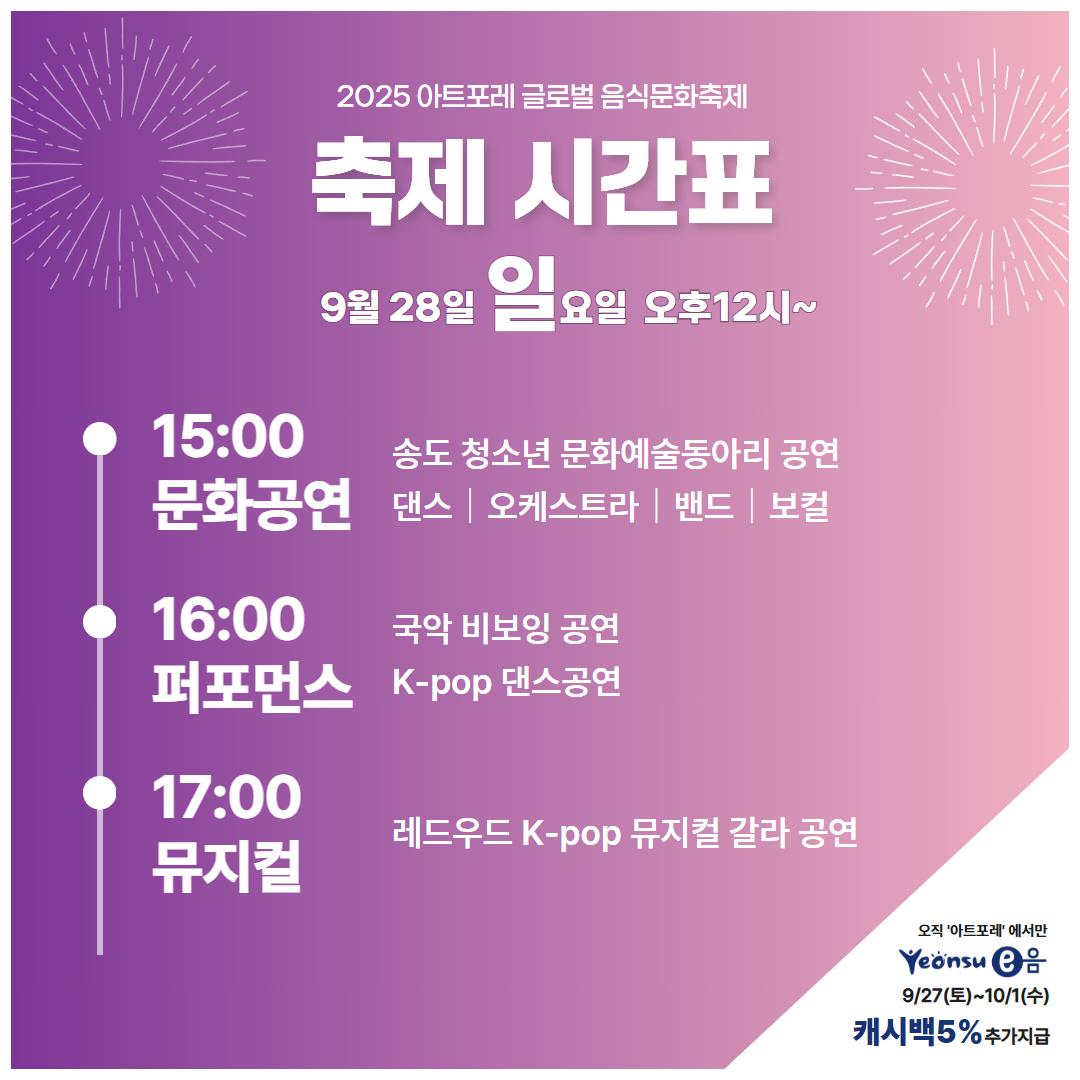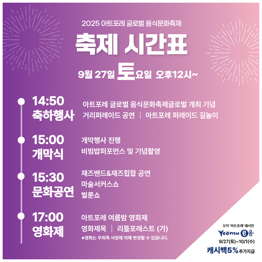 - 한입먹거리 장터: 아트포레 인기 맛집 13곳이 참여하여 글로벌 요리부터 디저트까지 다양한 음식을 선보입니다. 연수e음 카드로 결제 시 최대 15% 캐시백 혜택도 제공됩니다.