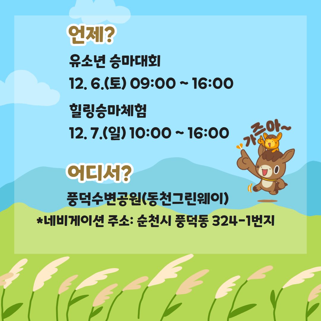 - 대회 다음날인 12월 7일에는 ‘힐링승마체험’이 열립니다. 단순한 체험이 아니라, 울타리 안 단순 원주(한 바퀴) 방식이 아니라 공원 내 잔디와 호수 주변(동천)을 따라 걷는 말과의 교감 + 힐링 프로그램이 될 예정입니다