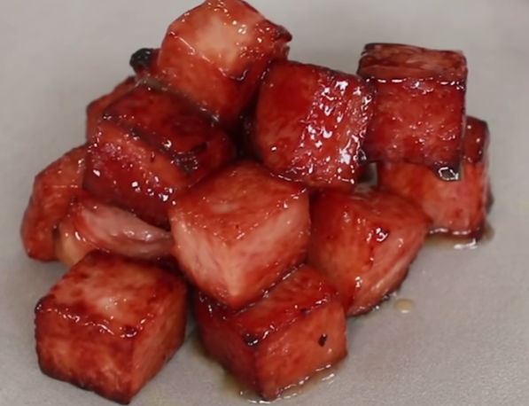 물과 설탕을 1:1로 섞은 것을 노릇하게 구운 스팸에 부워주고 졸여주면 완성됩니다.