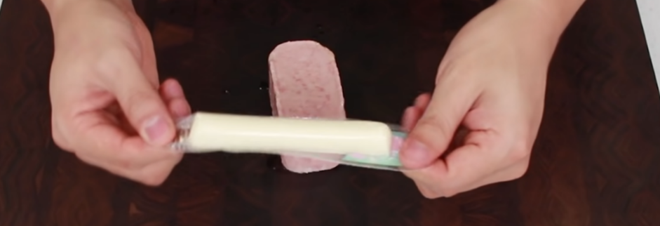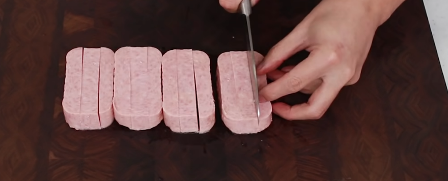 스팸을 길쭉한 모양으로 썰어줍니다.
