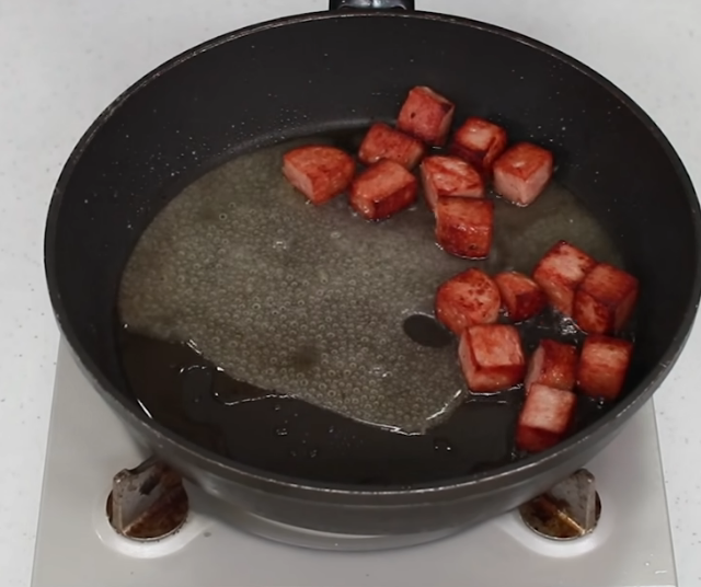 깍뚝썰기로 스팸을 썰어주고 사방으로 노릇하게 탈듯이 구워줍니다.