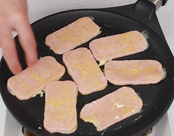 스팸을 달걀푼 물에 담궜다가 앞뒤로 노릇노릇 구워주면 됩니다.