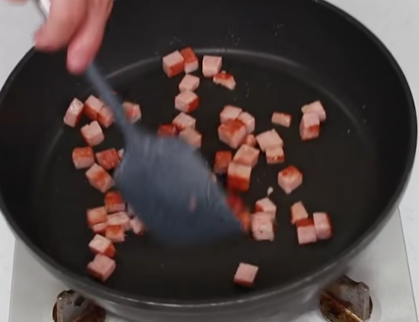 스팸을 아주 잘게 썰어서 노릇하게 볶아줍니다.