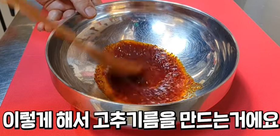 고추기름을 만들때의 팁은 기름에 고춧가루를 붓는 것이 아니라 고춧가루에 기름을 부어야 합니다.