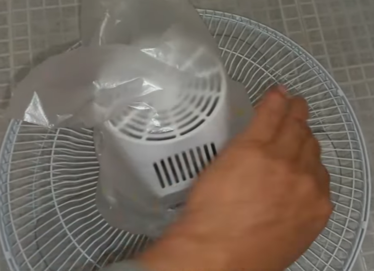 선풍기 모터 부분에 비닐을 하나 씌워줍니다.