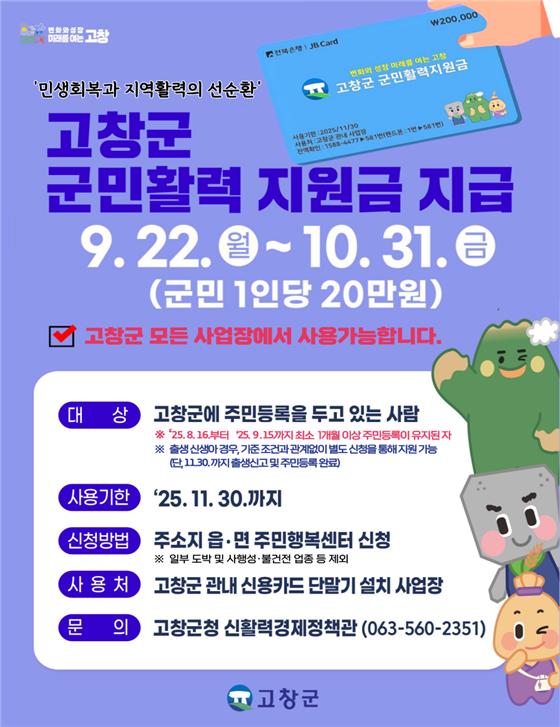 고창군은 2025년 추석을 앞두고 군민들의 생활 안정과 지역경제 활력 제고를 위해 '군민활력지원금'을 지급합니다.