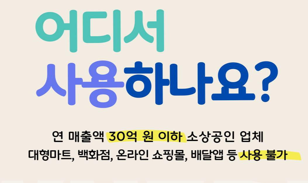 - 사용 가능 업종: 전통시장, 동네마트, 식당, 의류점, 미용실, 약국 등 연매출 30억 원 이하의 소상공인 가맹점