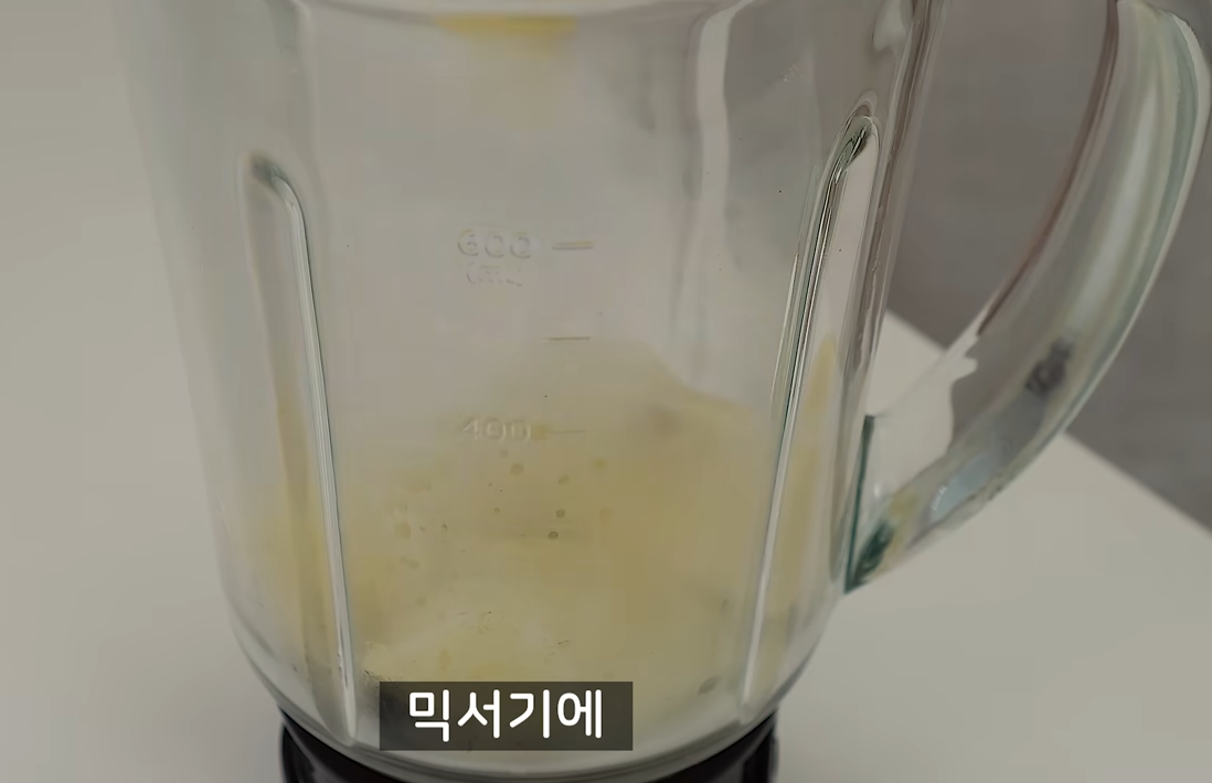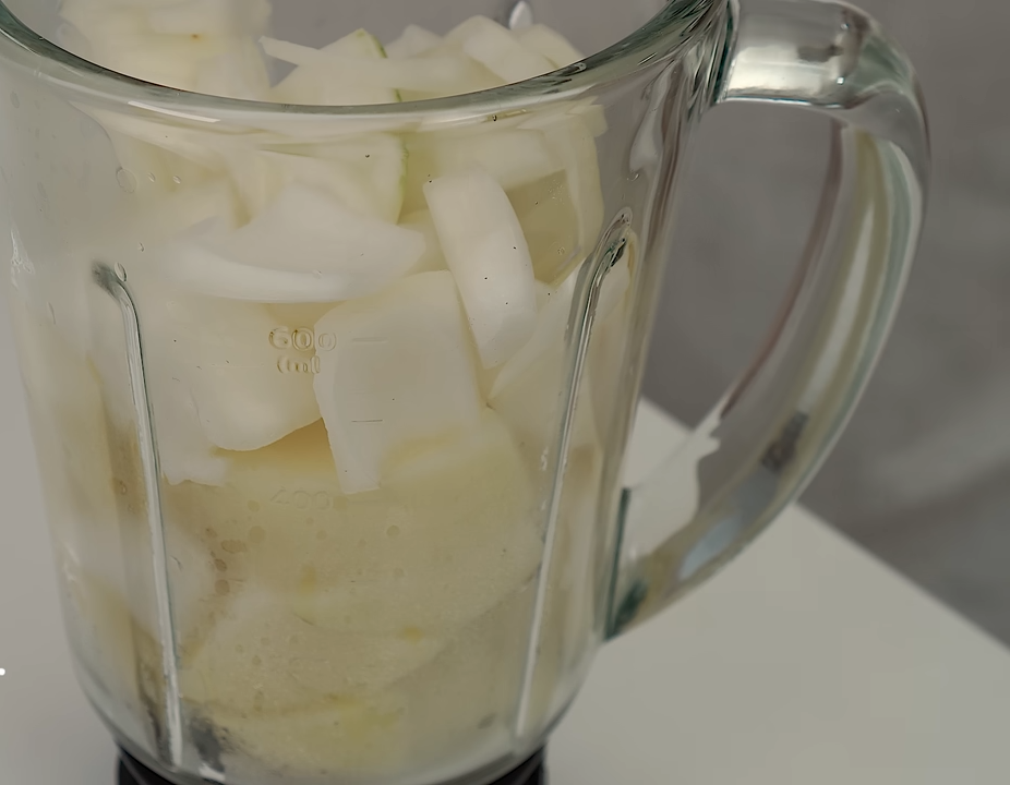 자른 양파를 감자가 들어있는 믹서기에 넣고 물 50g을 넣고 곱게 갈아주세요.