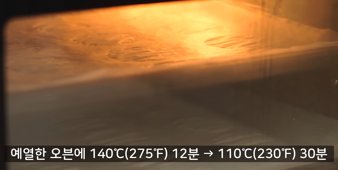 예열되어있는 오븐에 140도에서 12분 그리고 110도에서 30분간 익혀줍니다.