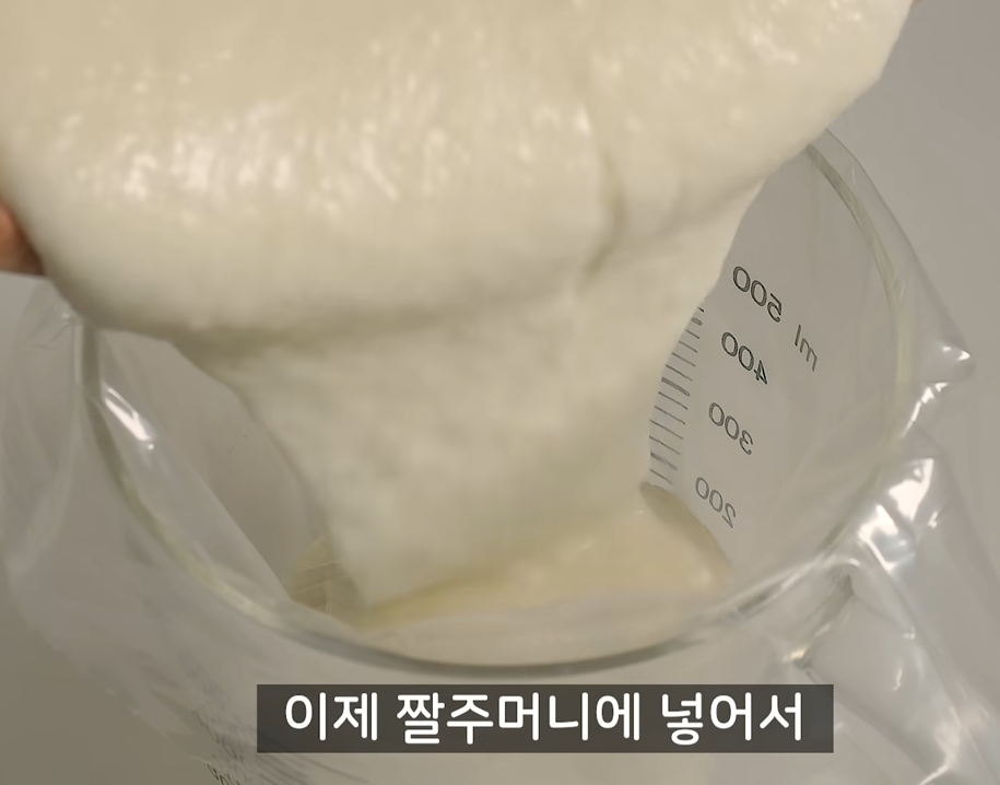 반죽을 짤주머니에 넣고 짤주머니를 잘 묶어줍니다.