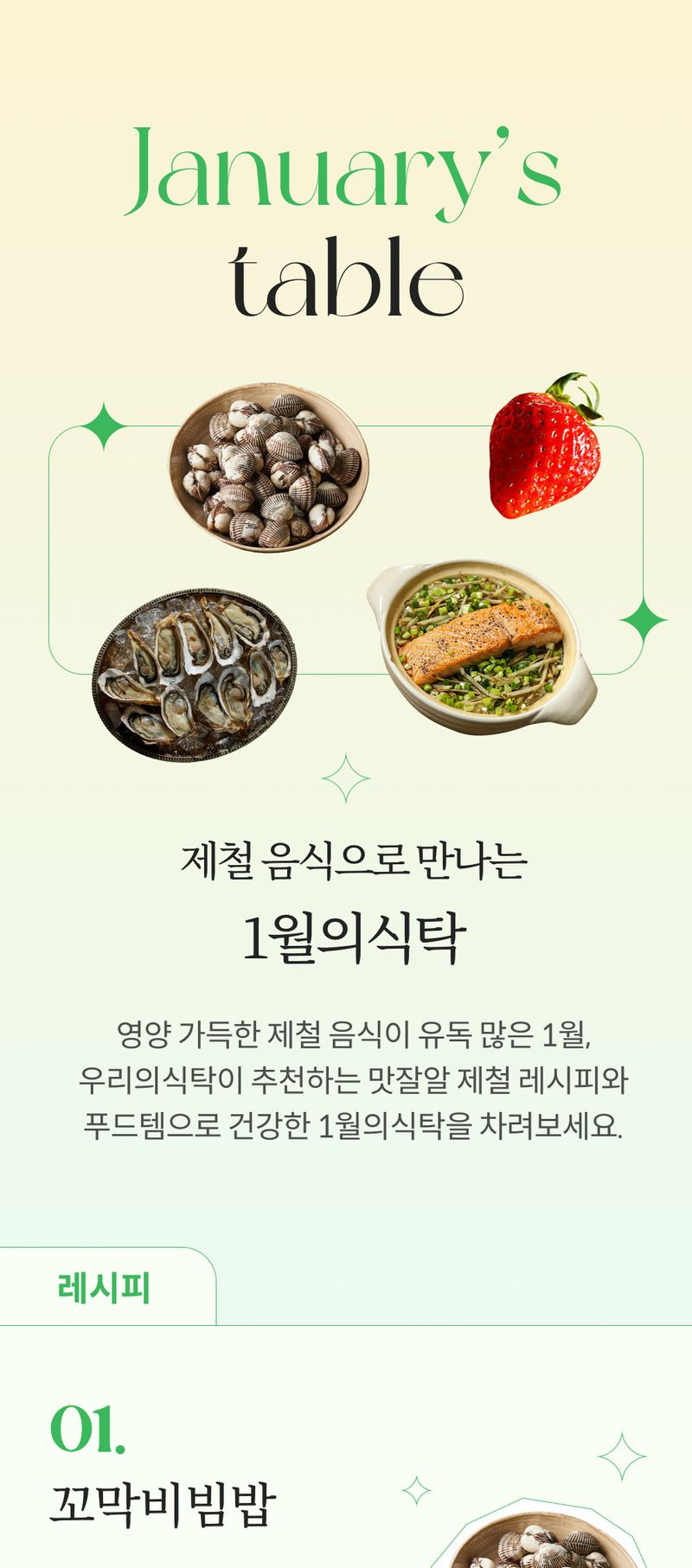 1월은 다양한 제철 음식이 풍부한 시기입니다. 우엉, 딸기, 고등어, 명태, 삼치 등 다양한 식재료를 활용하여 건강한 식단을 구성해 보세요. 제철 음식을 통해 자연의 맛을 느끼고, 건강을 챙기는 한 달이 되시길 바랍니다.