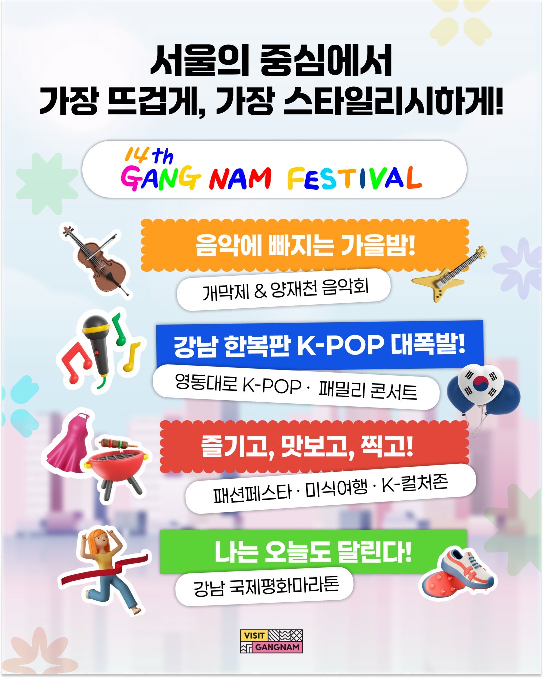 - 특징: 강남구 개청 50주년을 기념하는 비전 선포식이 함께 열리며, 뮤지컬 배우 김소현, 가수 테이 등과 50인 배우가 참여하는 뮤지컬 쇼, 영상·음악·춤·사물놀이·비보이 퍼포먼스 등이 어우러지는 스펙터클 무대를 선보입니다.