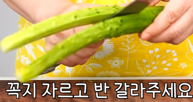 깨끗이 씻어 돌기를 제거한 오이를 반 갈라 줍니다.