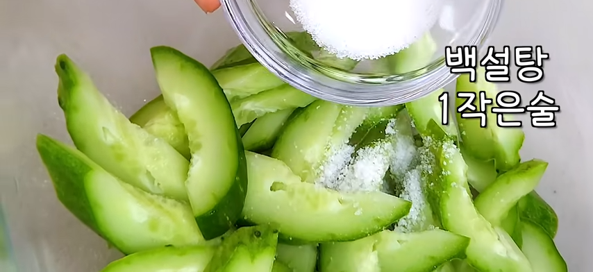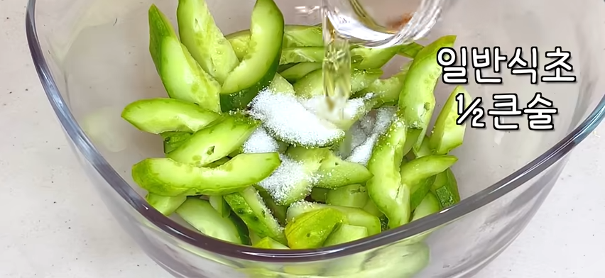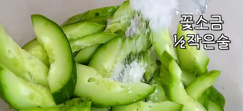 오이 절일때 – 꽃소금 ½작은술(tsp) 백설타 1작은술(tsp) 일반식초 ½큰술(Tbsp)