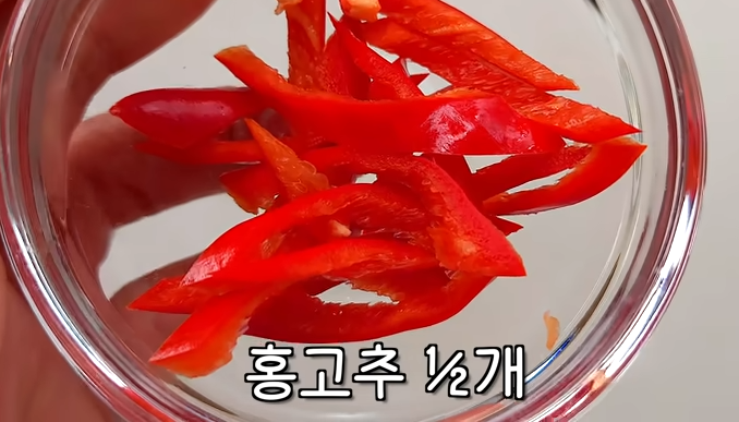 씨를 제거한 홍고추 반개를 썰어 무침에 넣어줍니다.