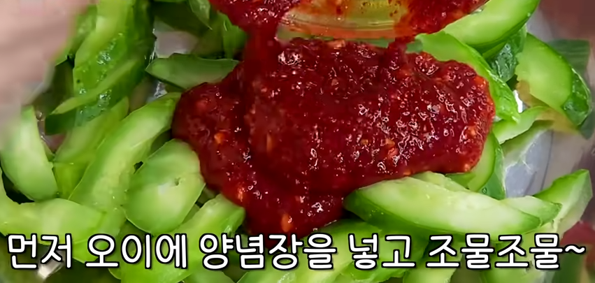 먼저 오이에 양념장반을 넣고 무쳐준 후에