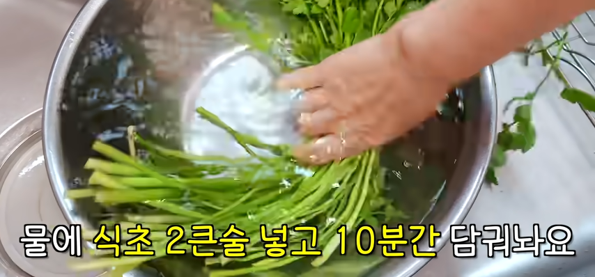 미나리는 끝에 질긴부분을 제거하고 노란잎을 없앤 후에 물에 식초를 두큰술 넣고 10분동안 담가 세척합니다.