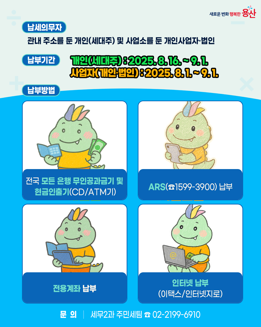 납세의무자 관내 주소를 둔 개인(세대주) 및 사업소를 둔 개인사업자·법인 ✅ 납부기간 - 개인(세대주) : 2025. 8. 16. ~ 9. 1. - 사업자(개인·법인) : 2025. 8. 1. ~ 9. 1. ✅ 납부방법 - 전국 모든 은행 무인공과금기 및 현금인출기(CD/ATM기) - 인터넷 납부(이택스/인터넷지로) - 전용계좌 납부