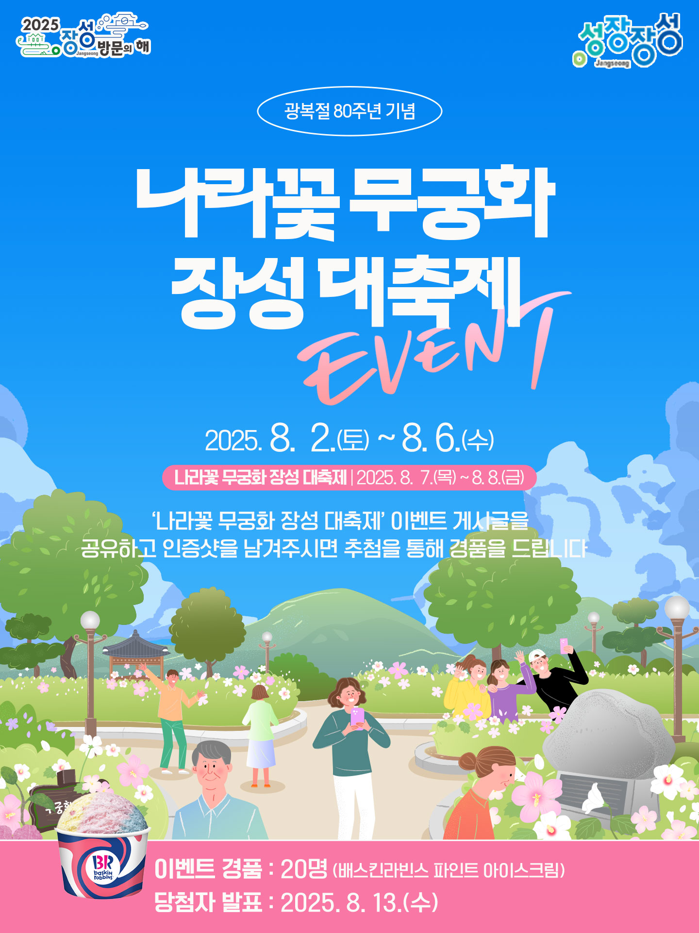 전라남도 장성에서 열리는 **2025년 ‘나라꽃 무궁화 장성대축제’**는 광복 80주년을 기념해 8월 7일부터 8일까지 이틀간 장성무궁화공원 일대에서 다양하고 뜻깊은 행사로 펼쳐집니다.