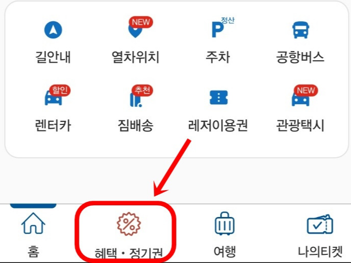 이렇게 설정해 둔 후에, 핸드폰에서 '코레일톡' 이라는 어플을 깔고 로그인을 한 뒤, 맨 아래쪽 하단에 보이는 정기,할인권을 클릭하여 들어가서 내가 해당하는 서비스를 클릭하면 최대 40% 할인 받을 수 있습니다.