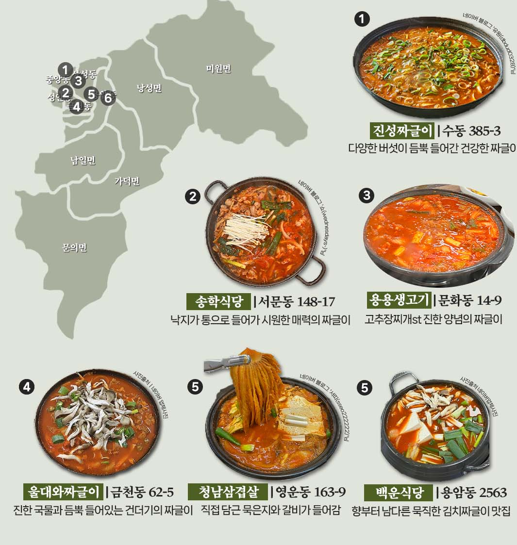 고기, 김치 넣고 끓여지는 다른 지역의 짜글이와 다르게 청주의 짜글이는 각종 버섯과 호박 등 야채를 듬뿍 넣고 끓여내는 게 특징! (그리고 짜글이, 울대찌개 등 고기 부위의 차이이며 비슷한 말임)