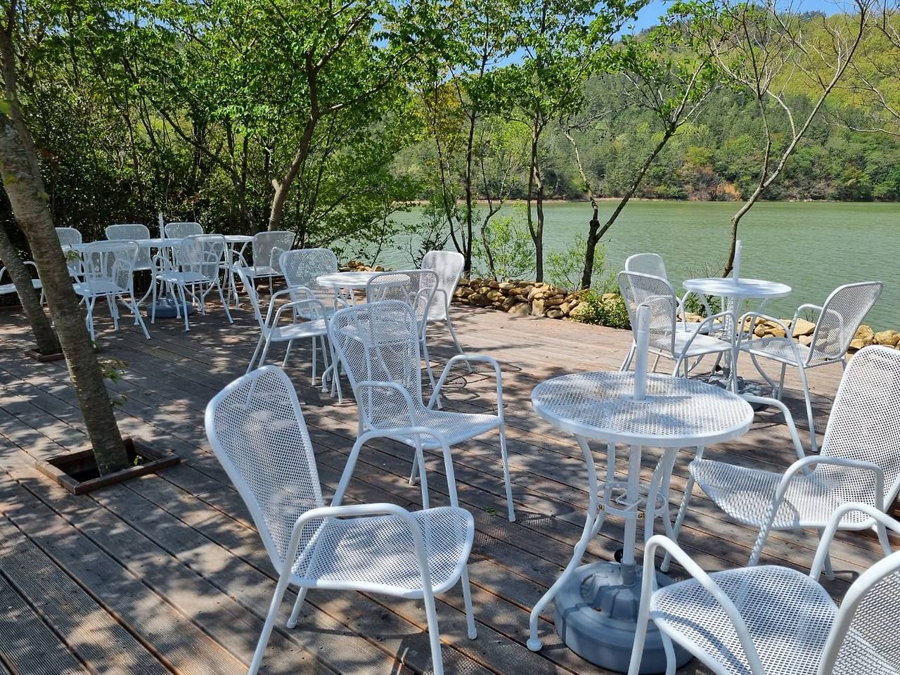 물가에 놓인 흰색 금속 의자와 테이블이 있는 공간은 정말 아늑하고 평화로운 분위기를 자아냈습니다.