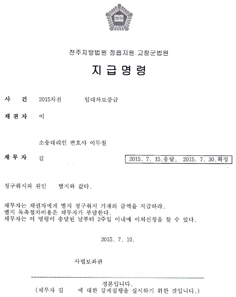 - 일반적으로 신청 후 1~2주 이내에 지급명령이 발급됩니다.