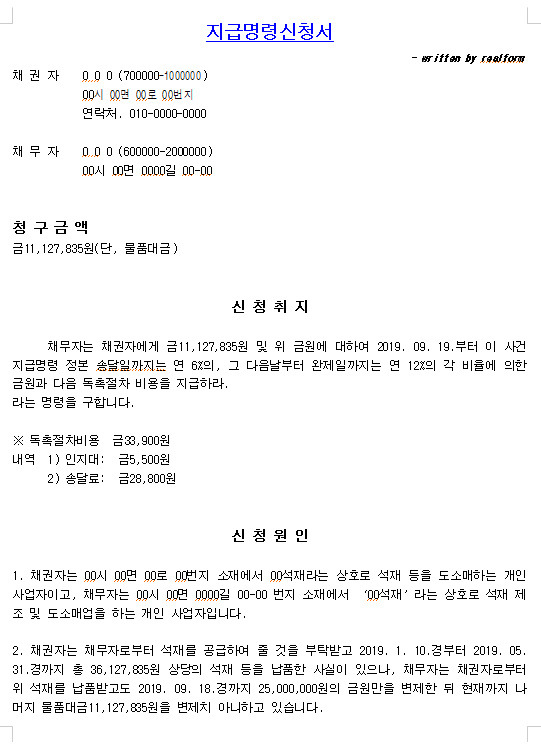 지급명령 신청서 작성 예시입니다.