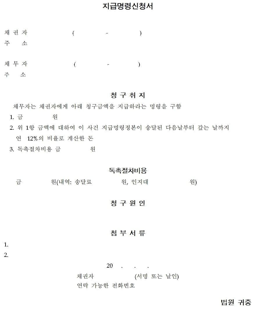 지급명령 신청서는 법원에서 제공하는 양식을 사용하여 작성합니다. 신청서에는 다음과 같은 내용이 포함되어야 합니다: