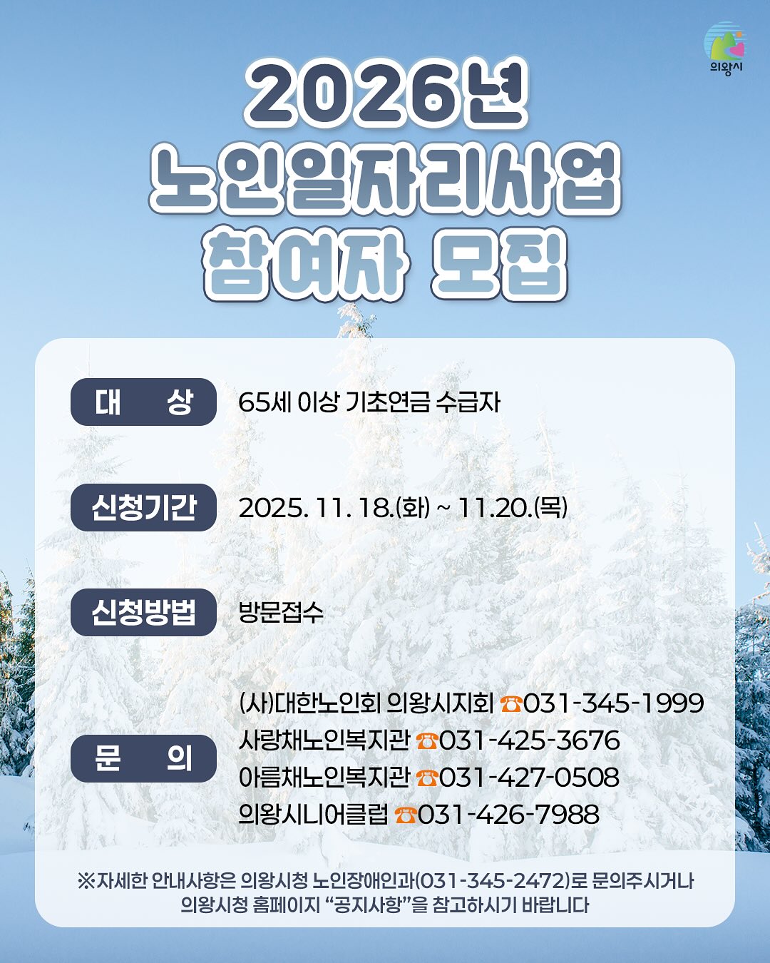 - 신청처: (사)대한노인회 의왕시지회, 사랑채노인복지관, 아름채노인복지관, 의왕시니어클럽