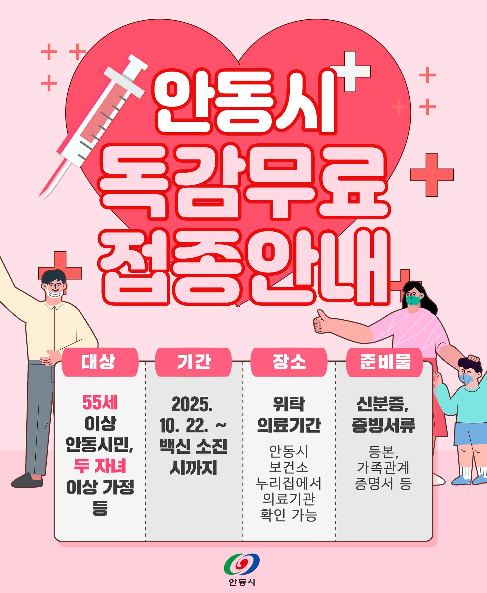 안동시의 올해 무료 인플루엔자(독감) 예방접종 안내를 아래와 같이 정리해드립니다. 접종 대상과 시기 등은 매년 조금씩 달라질 수 있으니, 접종 전 반드시 보건소 또는 지정의료기관에 확인해 주세요.