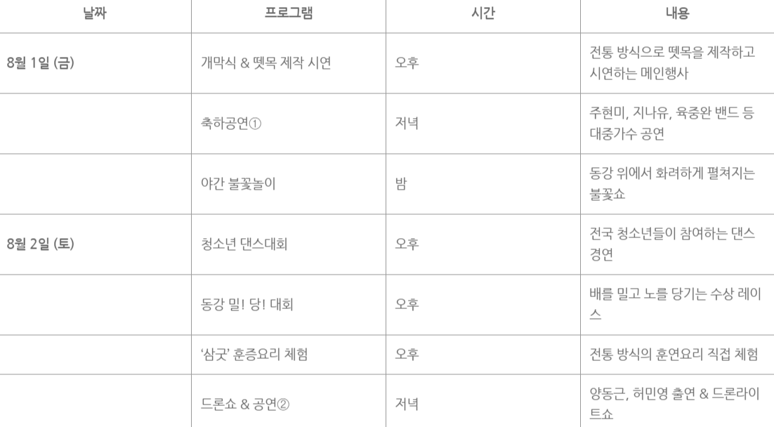 - 뗏목 제작·고사·시연: 전통 방식 그대로 뗏목을 제작하여 고사를 지낸 후 강에 띄우는 과정을 보여주는 대표 행사입니다