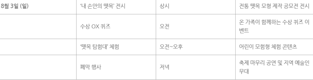 - 청소년 댄스대회, 수상 OX 퀴즈, 삼굿 시연, 워터파크/카누 체험 등 다양한 놀이와 공연으로 알차게 구성되어 있습니다