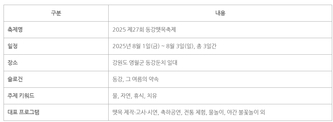 - 축제 슬로건은 **“동강, 그 여름의 약속”**으로, ‘물·자연·휴식·치유’를 핵심 키워드로 구성돼 있습니다
