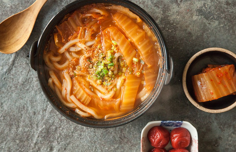 한국의 전통 발효 음식인 김치와 일본의 우동이 조화롭게 어우러져 색다른 맛을 느낄 수 있습니다.