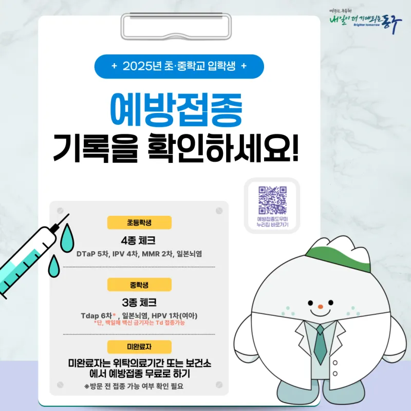 2025년 초‧중학교에 입학하는 학생들은 다음과 같은 예방접종을 받아야 합니다.