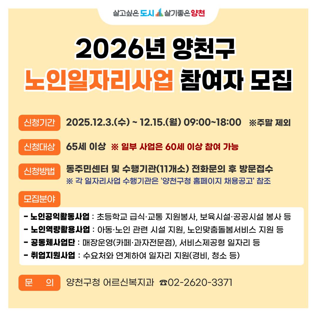 2026년도 양천구 노인일자리사업 참여자를 2025.12.03.(수) ~ 12.15.(월)까지 모집합니다. 관심있는 어르신들의 많은 참여 바랍니다. 💡