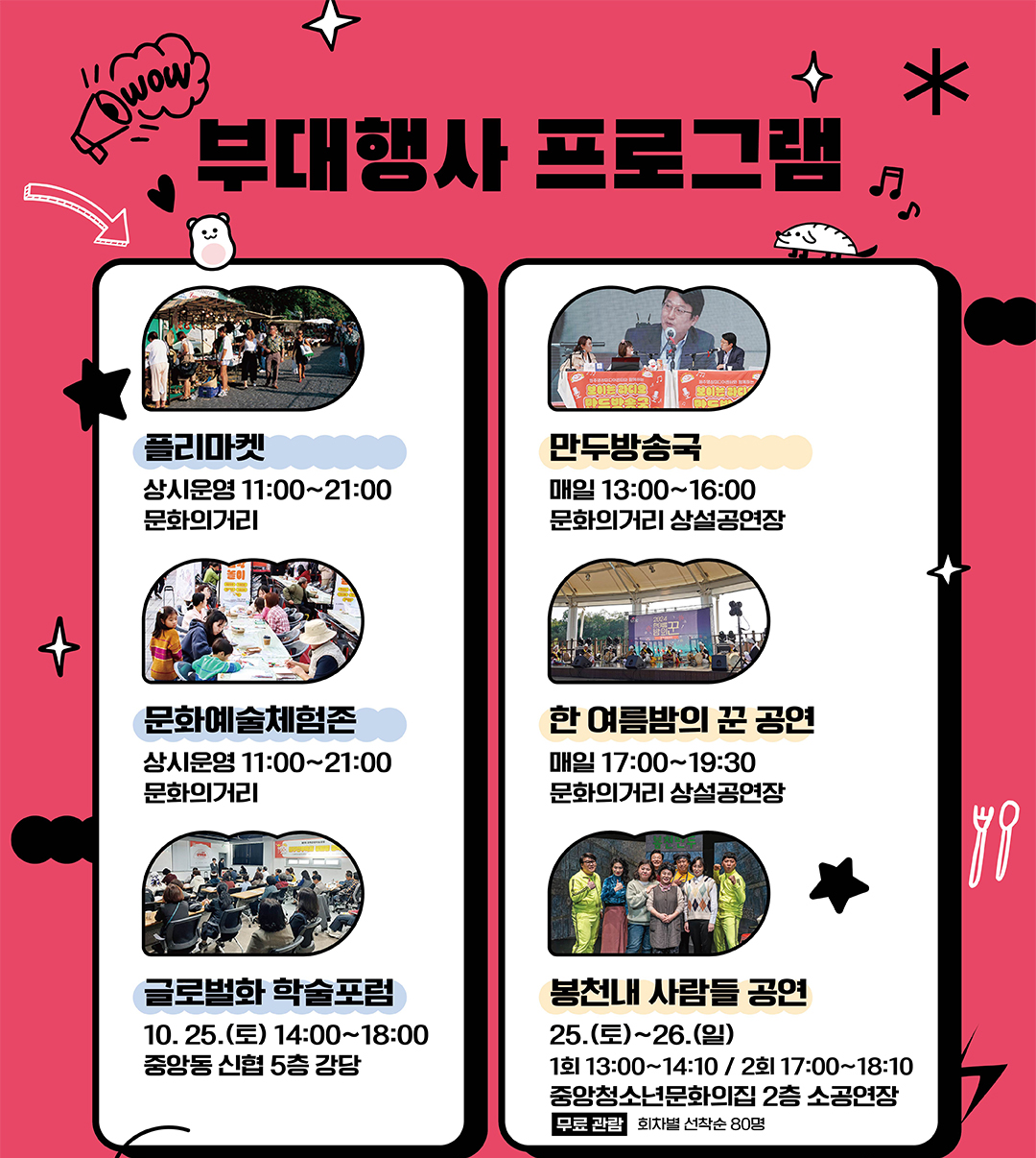 혹시 프로그램 일정표, 입장료 여부, 특별 게스트나 공연 내용 등이 필요하시면 제가 찾아볼까요?