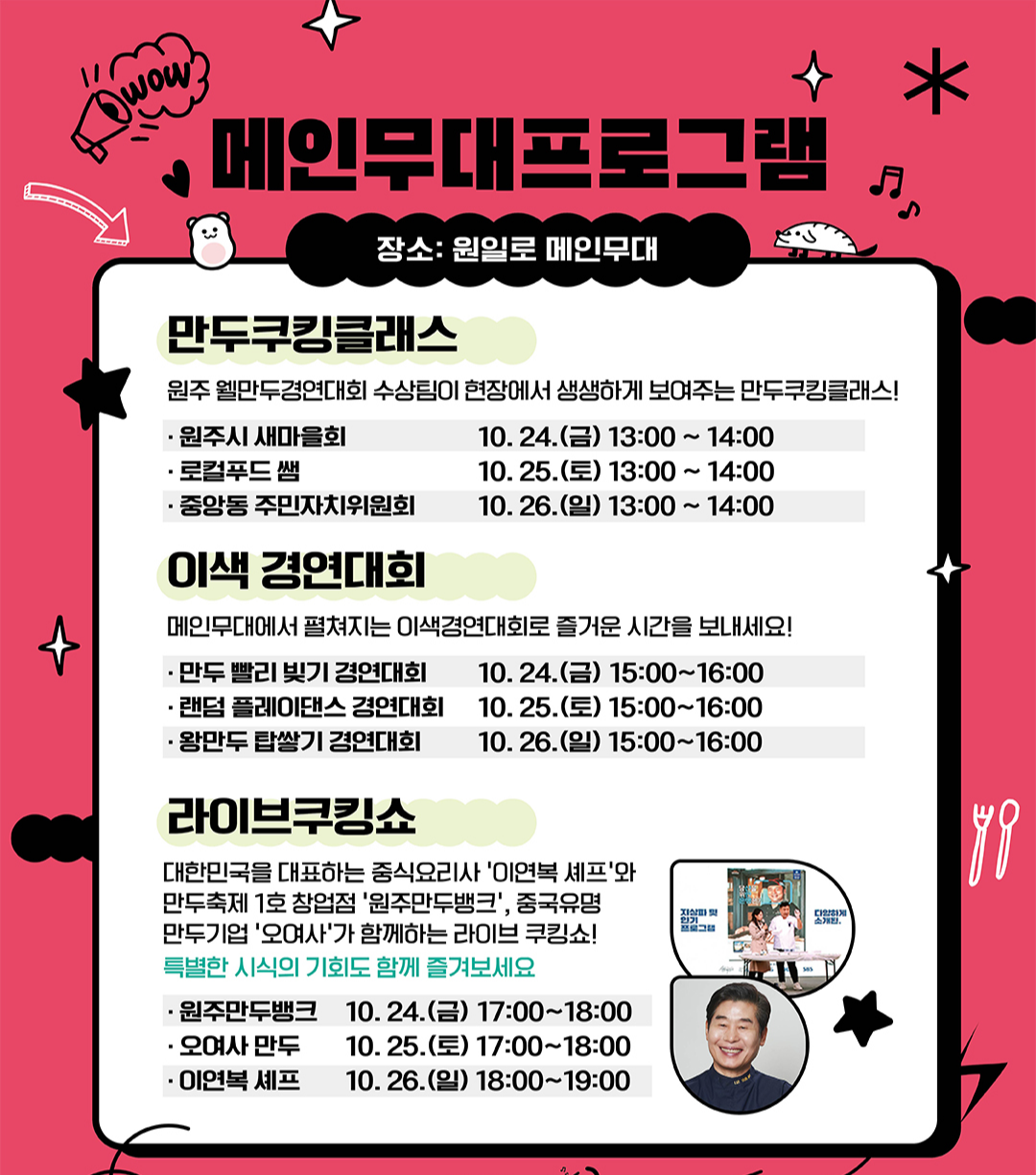 - “만두의 세계 여행… ‘원주는 만두, 만두는 원주’” 라는 표현처럼, 지역 특색을 살린 만두 메뉴나 퓨전 만두 등도 기대되는 행사입니다.