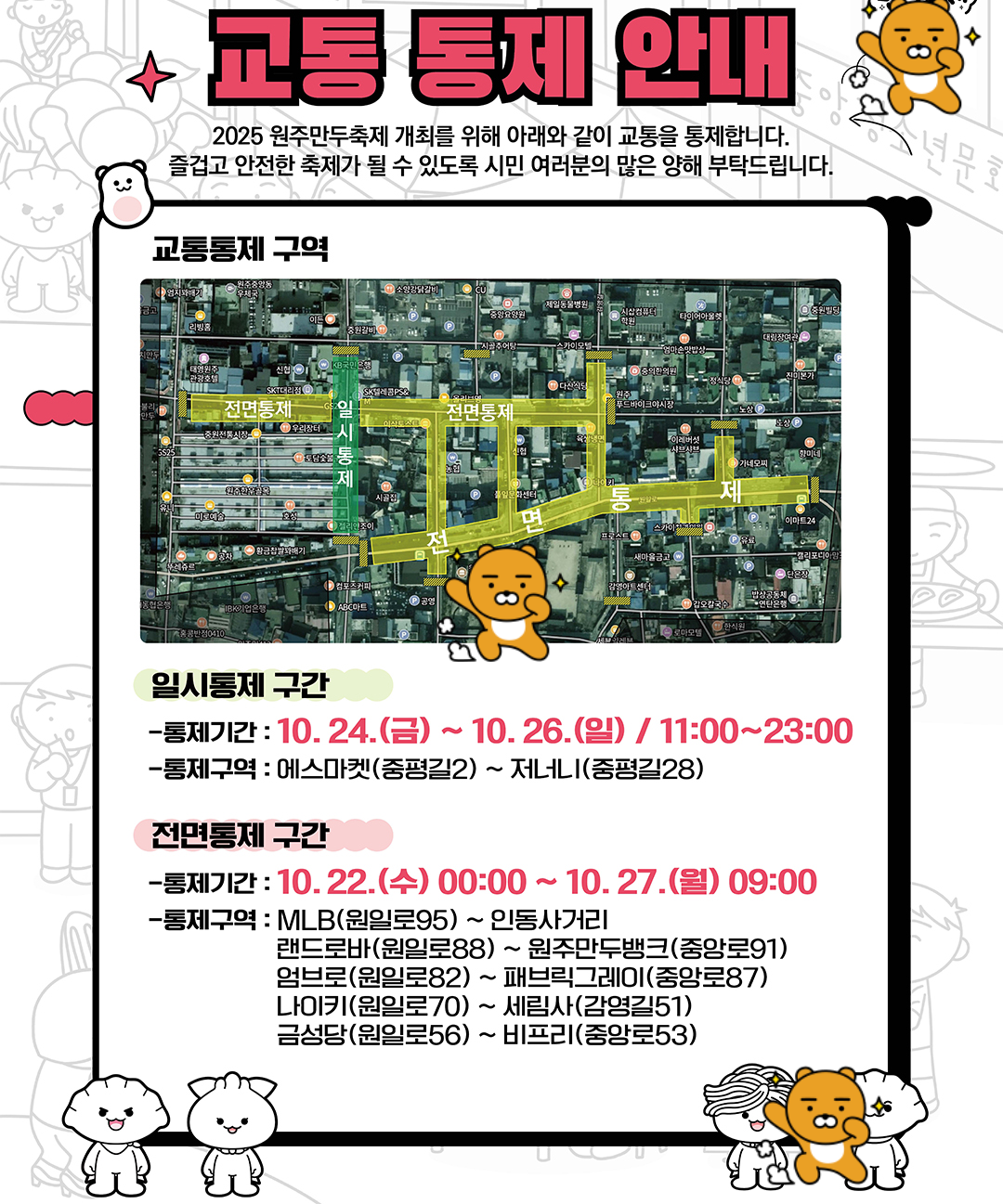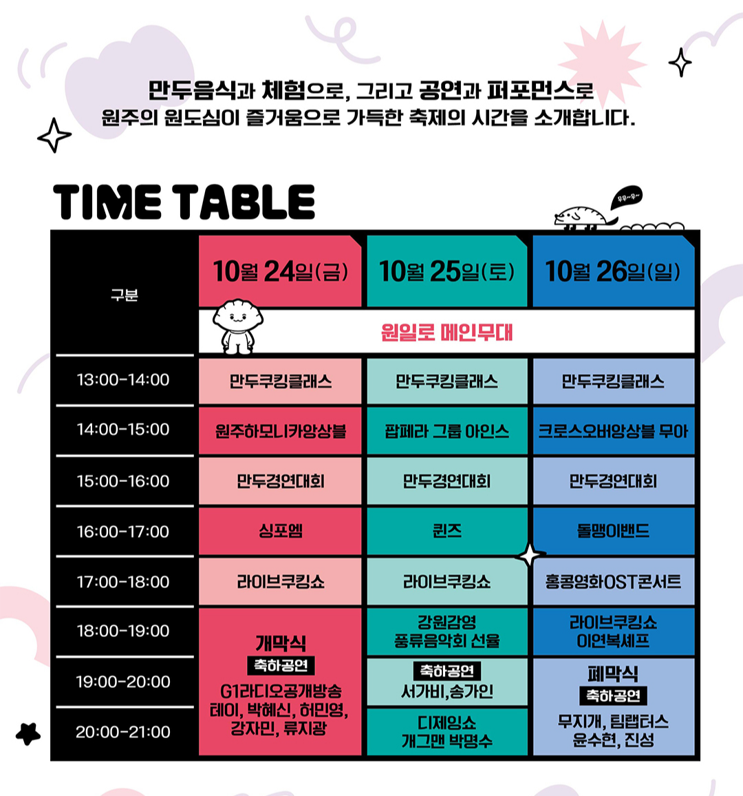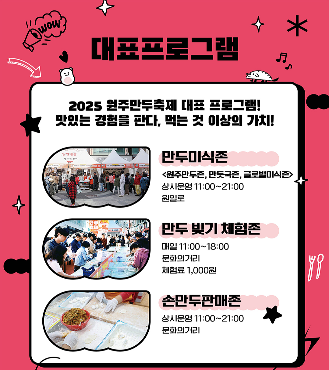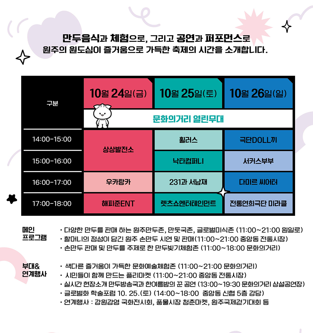 - 축제 기간 동안 원일로 및 문화의 거리 일대가 만두 테마 거리로 꾸며져, 다양한 만두 먹거리와 체험 부스가 마련됩니다.
